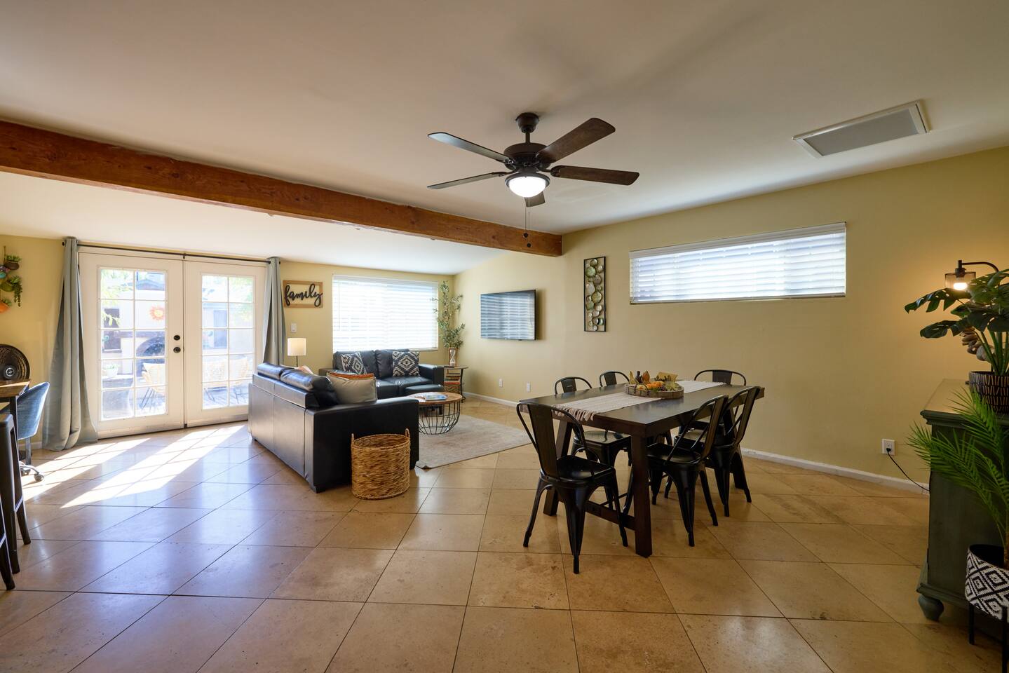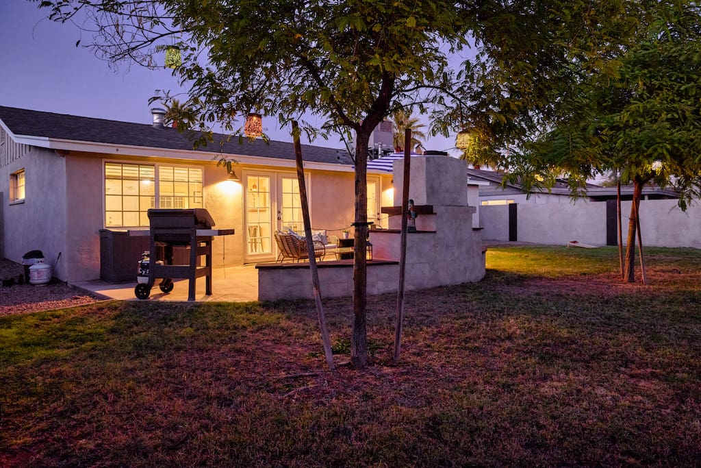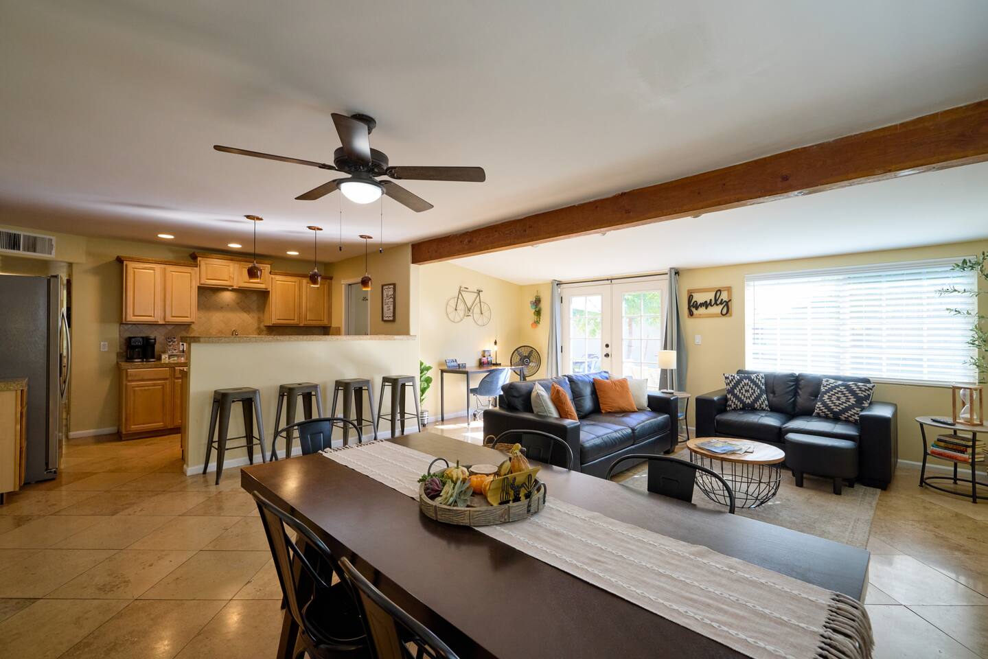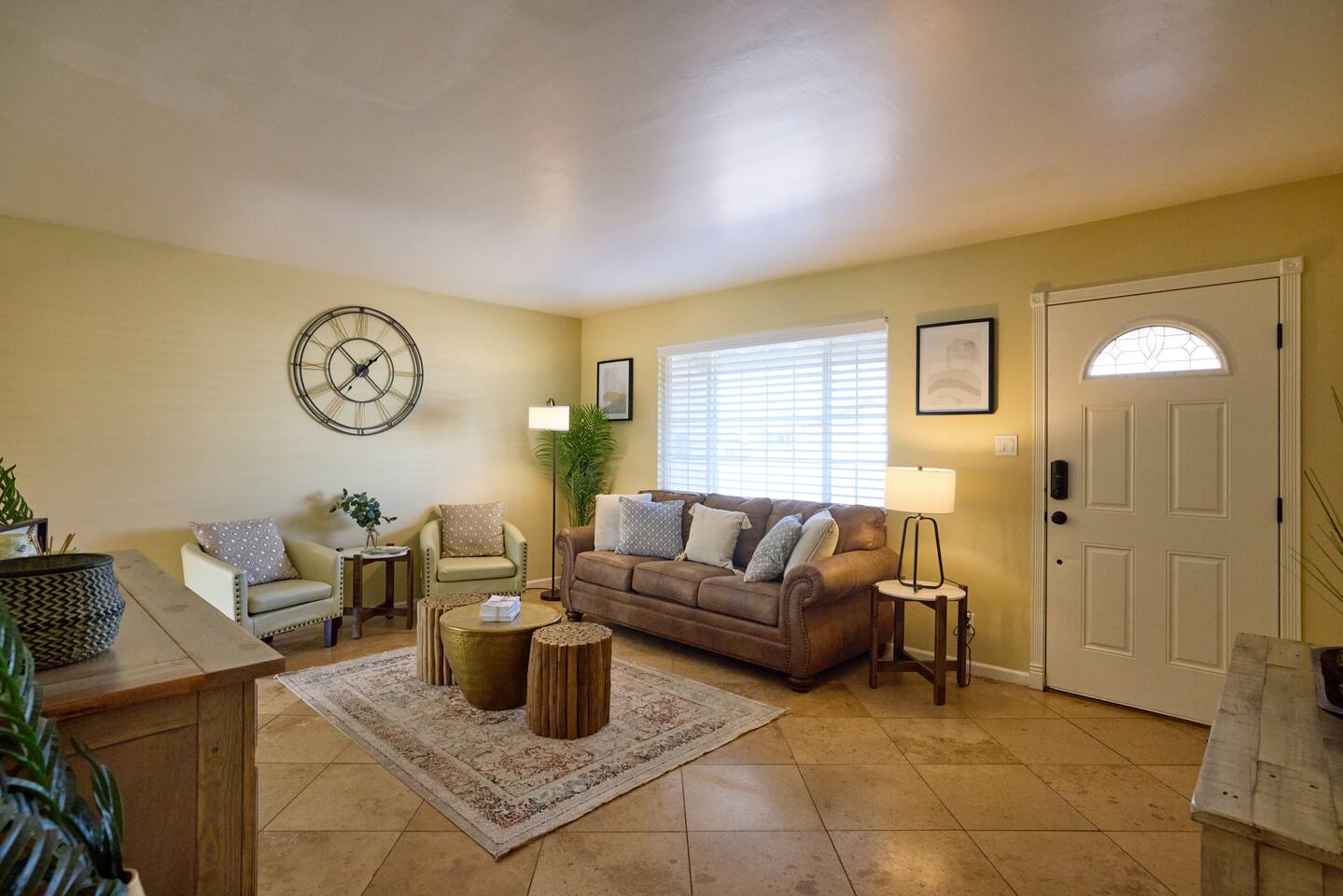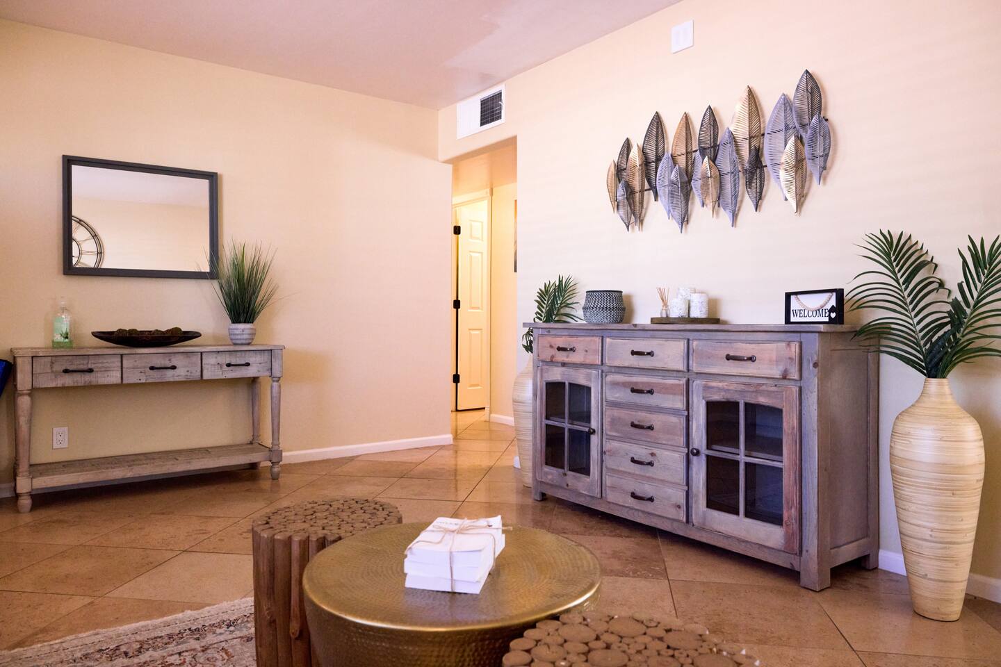 🌵 Welcome to Desert Dream Your warm and spacious retreat just minutes from vibrant Old Town Scottsdale. This beautiful home blends classic desert charm with modern comfort, featuring tile floors, tasteful décor, and all the essentials for a relaxing and memorable stay. We prioritize a clean and sanitary environment for every guest, with professional cleanings performed before each stay to ensure your comfort and peace of mind. Whether you're planning a quick getaway or an extended visit, Desert Dream offers the perfect setting for your Arizona escape. 🏡 Home Features 🐾 Pet-Friendly – Up to 2 pets welcome per stay ($125 additional pet fee applies) 🌞 Backyard Oasis Step through the double doors and enjoy the indoor-outdoor flow to a beautiful private backyard featuring: Outdoor dining table with umbrella Cozy fireplace and BBQ grill Comfortable seating area Corn hole set for outdoor fun Large natural grass area perfect for kids and dogs to run, play, and enjoy the outdoors 🍽️ Fully Equipped Kitchen – Premium Café appliances with coffee, creamer, tea, and snacks included 💧 Filtered Water – Available at the kitchen sink and refrigerator via a reverse osmosis system 🛏️ Sleeps Up to 8 Guests – 3 bedrooms, 4 beds, + 1 pull-out sofa bed 🌐 High-Speed WiFi – Ideal for streaming, working remotely, or staying connected 📺 Streaming Services – 5 complimentary streaming services (Hulu, Disney+, Peacock, Paramount+, HBO Max) Bedroom 1 – Master Suite, 1 king bed En-suite bathroom with jetted soaking tub, a separate walk-in shower, and a private toilet room Smart TV – your own personal retreat Bedroom 2 Queen-size bed Cozy and ideal for couples or solo travelers Bedroom 3 Two Twin beds Perfect for kids or friends sharing a room Bonus Sleeping Space Pull-out sofa in the front living room converts to a full-size bed Great for extra guests or larger groups Hallway Bathroom Full bath with essentials included 🛋️ Two Comfortable Living Rooms Living Room 1 Located at the front of the house Stylish décor, and a welcoming atmosphere to relax Living Room 2 Bright and open space with large Smart TV Includes dining area and a dedicated workspace Flows seamlessly into the kitchen — the true heart of the home 🎲 Board games conveniently located near the dining table 🧺 Laundry Room Large washer and dryer Laundry detergent, dryer sheets, iron, and ironing board provided