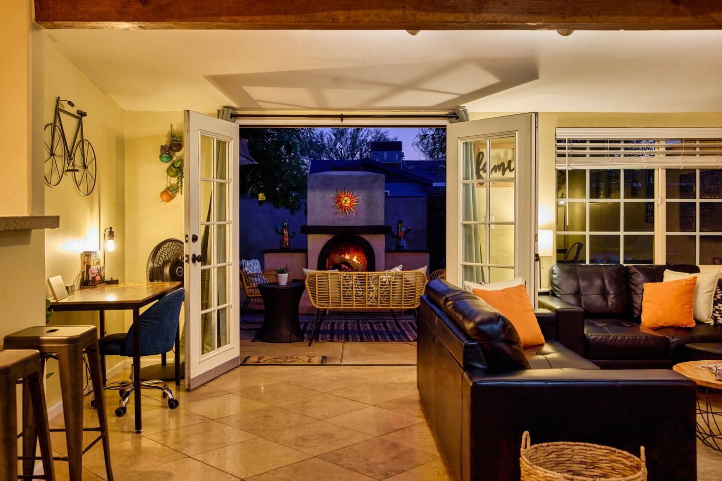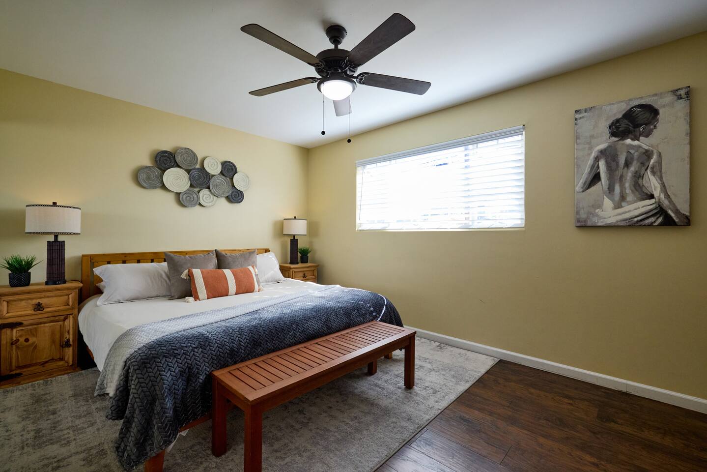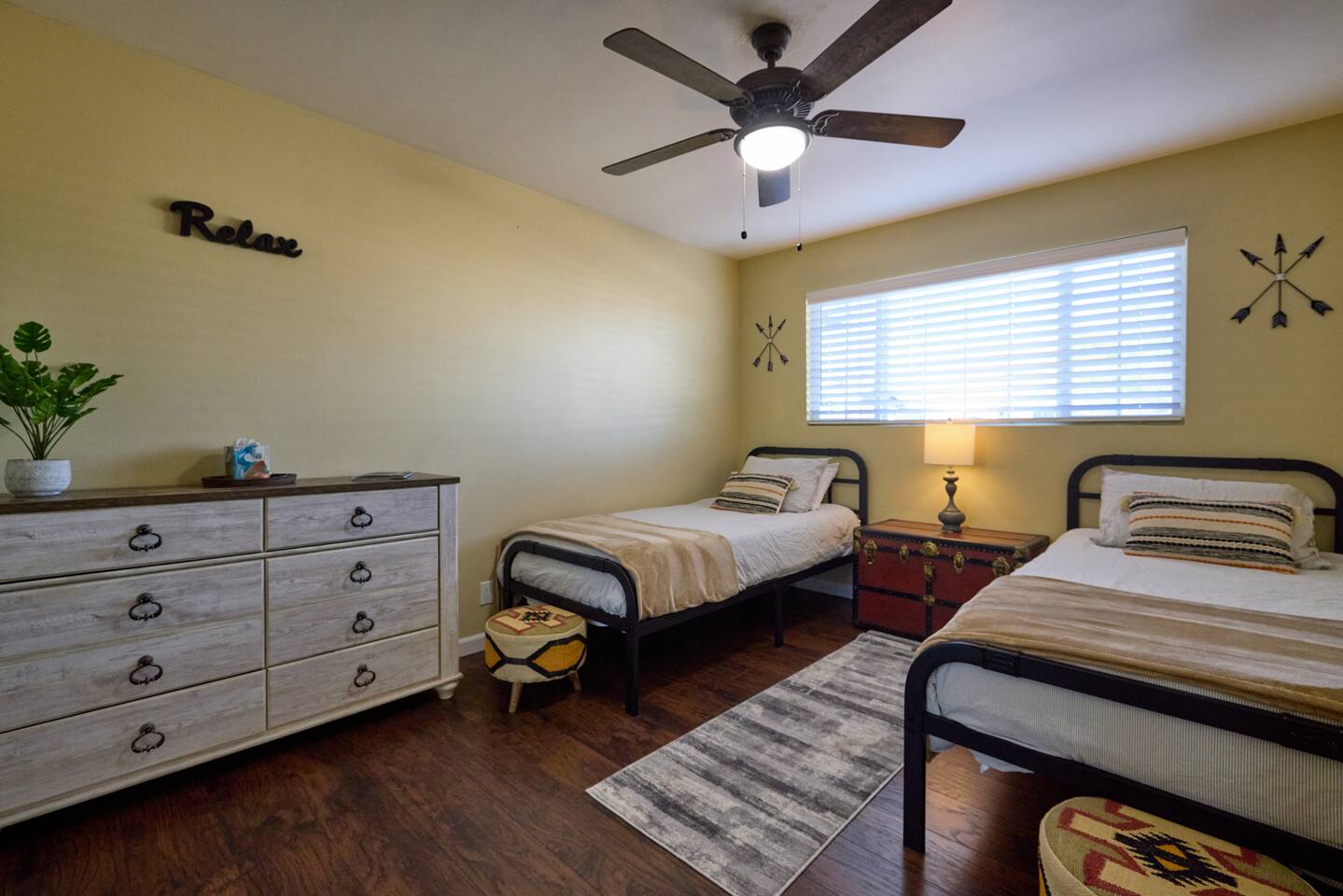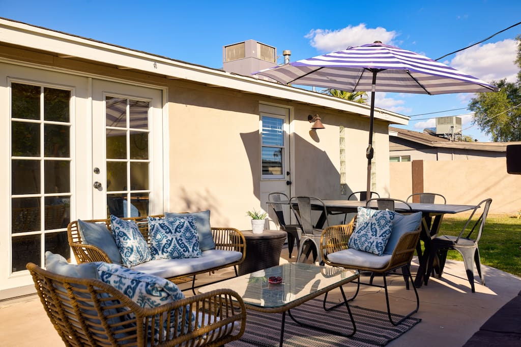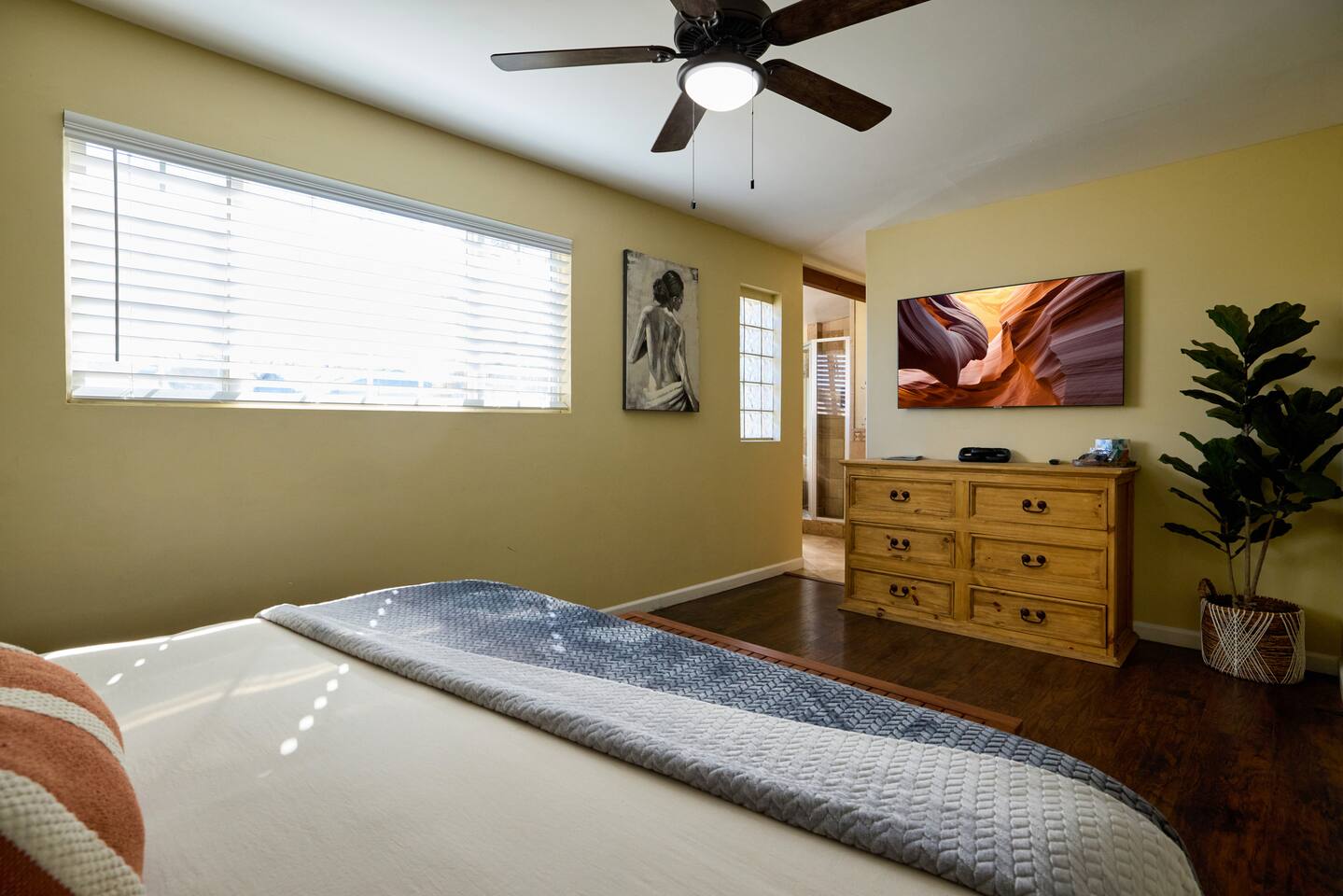 🌵 Welcome to Desert Dream Your warm and spacious retreat just minutes from vibrant Old Town Scottsdale. This beautiful home blends classic desert charm with modern comfort, featuring tile floors, tasteful décor, and all the essentials for a relaxing and memorable stay. We prioritize a clean and sanitary environment for every guest, with professional cleanings performed before each stay to ensure your comfort and peace of mind. Whether you're planning a quick getaway or an extended visit, Desert Dream offers the perfect setting for your Arizona escape. 🏡 Home Features 🐾 Pet-Friendly – Up to 2 pets welcome per stay ($125 additional pet fee applies) 🌞 Backyard Oasis Step through the double doors and enjoy the indoor-outdoor flow to a beautiful private backyard featuring: Outdoor dining table with umbrella Cozy fireplace and BBQ grill Comfortable seating area Corn hole set for outdoor fun Large natural grass area perfect for kids and dogs to run, play, and enjoy the outdoors 🍽️ Fully Equipped Kitchen – Premium Café appliances with coffee, creamer, tea, and snacks included 💧 Filtered Water – Available at the kitchen sink and refrigerator via a reverse osmosis system 🛏️ Sleeps Up to 8 Guests – 3 bedrooms, 4 beds, + 1 pull-out sofa bed 🌐 High-Speed WiFi – Ideal for streaming, working remotely, or staying connected 📺 Streaming Services – 5 complimentary streaming services (Hulu, Disney+, Peacock, Paramount+, HBO Max) Bedroom 1 – Master Suite, 1 king bed En-suite bathroom with jetted soaking tub, a separate walk-in shower, and a private toilet room Smart TV – your own personal retreat Bedroom 2 Queen-size bed Cozy and ideal for couples or solo travelers Bedroom 3 Two Twin beds Perfect for kids or friends sharing a room Bonus Sleeping Space Pull-out sofa in the front living room converts to a full-size bed Great for extra guests or larger groups Hallway Bathroom Full bath with essentials included 🛋️ Two Comfortable Living Rooms Living Room 1 Located at the front of the house Stylish décor, and a welcoming atmosphere to relax Living Room 2 Bright and open space with large Smart TV Includes dining area and a dedicated workspace Flows seamlessly into the kitchen — the true heart of the home 🎲 Board games conveniently located near the dining table 🧺 Laundry Room Large washer and dryer Laundry detergent, dryer sheets, iron, and ironing board provided